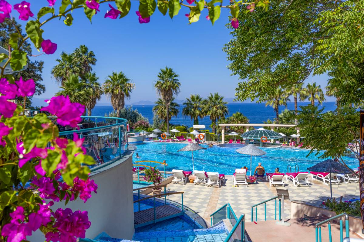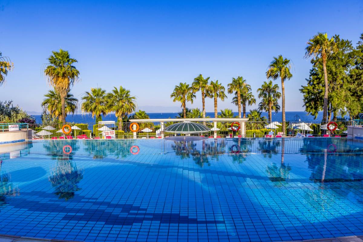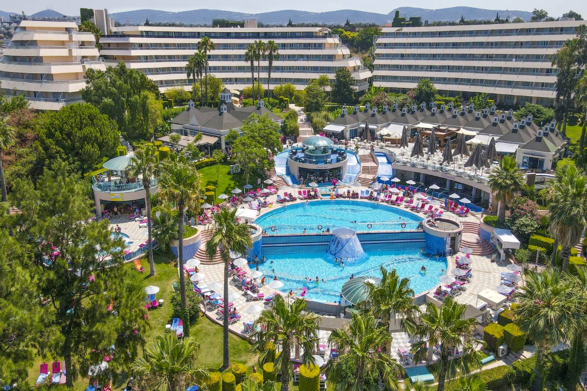 Kuşadası tarihi yerleri, doğal güzellikleri ve gece hayatı ile Ege’nin en gözde tatil beldelerinden bir tanesi… İzmir Adnan Menderes Havaalanına 75 Km, Efes’e 18 Km uzaklıkta, Kuşadası Şehir Merkezine 3 Km uzaklıkta bulunan, Ege’nin masmavi sularına açılan plajları ile ünlü “Kadınlar Denizi” bölgesinde yer alan The Grand Blue Sky International, eşsiz panoramik manzarası, muhteşem gün batımı, kendine özel “mavi bayraklı” turkuaz rengi denizi ve plajı ile siz değerli konuklarını bekliyor.
